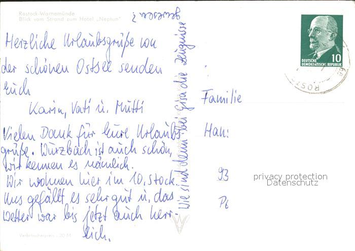 72069518 alte Postkarte Rostock-Warnemuende Blick vom Strand zum Hotel Neptun postalisch gelaufen Erhaltung siehe scans KatCode: 11110013003000
