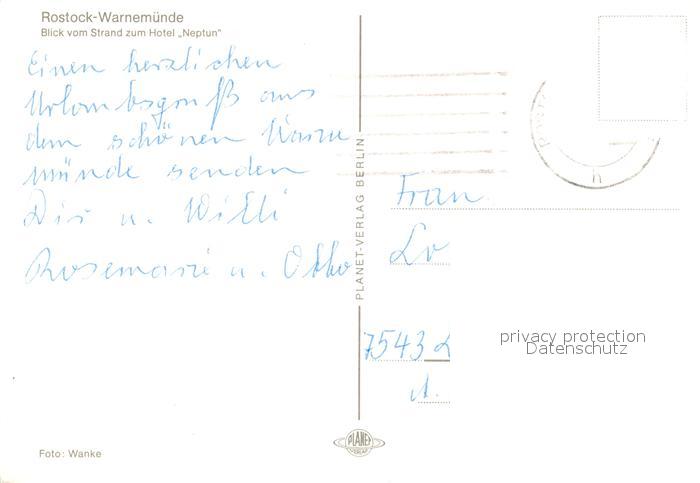 73162557 alte Postkarte Rostock-Warnemuende Blick vom Strand zum Hotel Neptun postalisch gelaufen Erhaltung siehe scans [FriedD77] KatCode: 11110013003000