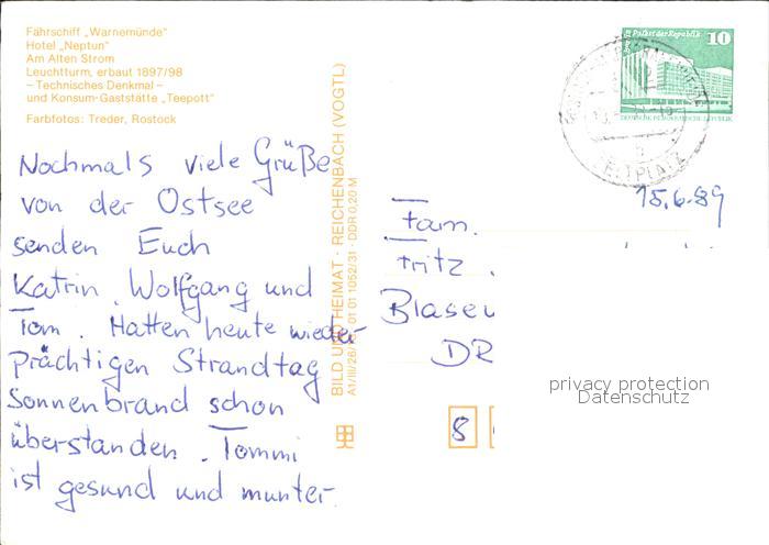 72291565 alte Postkarte Rostock-Warnemuende Faehrschiff Warnemuende Hotel Neptun Leuchtturm postalisch gelaufen Erhaltung siehe scans KatCode: 11110013003000