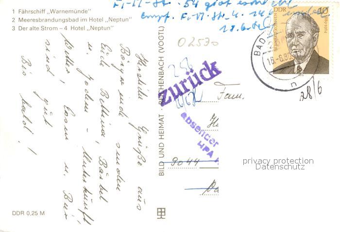 72941240 alte Postkarte Rostock-Warnemuende Faehrschiff Warnemuende Hotel Neptun postalisch gelaufen Erhaltung siehe scans [NatalD47] KatCode: 11110013003000