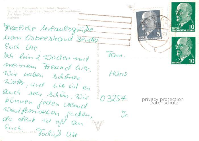 72939256 alte Postkarte Rostock-Warnemuende Hotel Neptun Gaststaette Teepott Leuchtturm Kurhaus postalisch gelaufen Erhaltung siehe scans [PaolaD17] KatCode: 11110013003000
