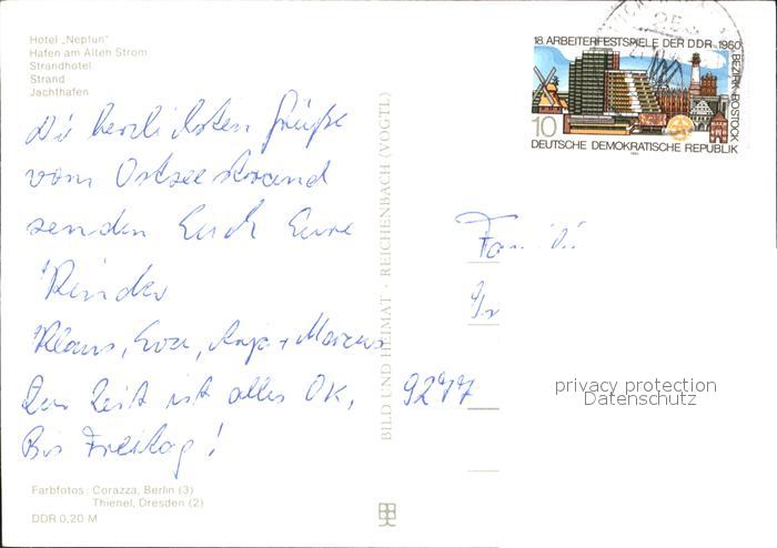 72313555 alte Postkarte Rostock-Warnemuende Hotel Neptun Hafen am Alten Strom Strandhotel Strand Jachthafen postalisch gelaufen Erhaltung siehe scans KatCode: 11110013003000
