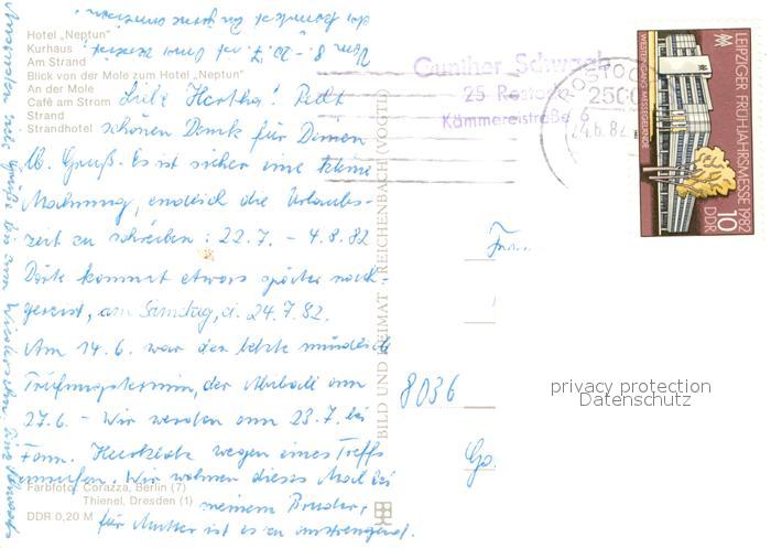 73155356 alte Postkarte Rostock-Warnemuende Hotel Neptun Kurhaus Strand Mole Cafe am Strom Strandhotel postalisch gelaufen Erhaltung siehe scans [WerneD78] KatCode: 11110013003000