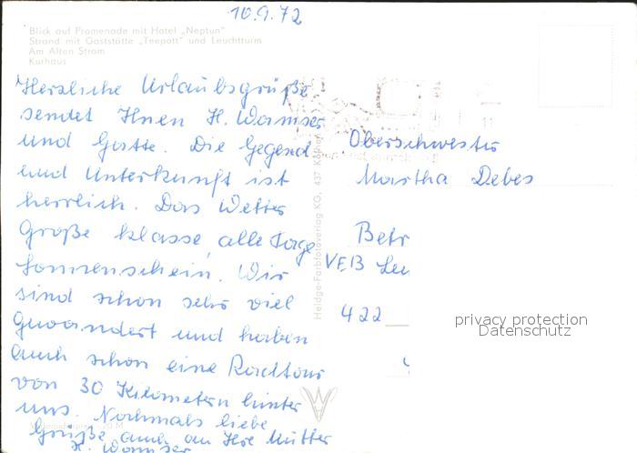 72325136 alte Postkarte Rostock-Warnemuende Hotel Neptun Promenade Strand Gaststaette Teepott Leuchtturm Am Alten Strom Kurhaus postalisch gelaufen Erhaltung siehe scans KatCode: 11110013003000