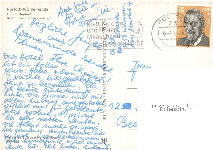 73634786 alte Postkarte Rostock-Warnemuende Hotel Neptun Restaurant Seemannskrug postalisch gelaufen Erhaltung siehe scans [WerneD78] KatCode: 11110013003000