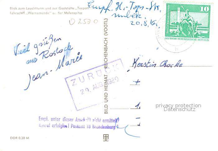 72917352 alte Postkarte Rostock-Warnemuende Leuchtturm Gaststaette Teepott Faehrschiff Warnemuende postalisch gelaufen Erhaltung siehe scans [PaolaD17] KatCode: 11110013003000