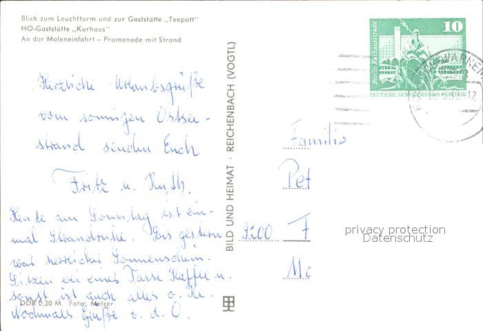 72355927 alte Postkarte Rostock-Warnemuende Leuchtturm Gaststaette Teepott HOG Kurhaus Moleneinfahrt Promenade Strand postalisch gelaufen Erhaltung siehe scans KatCode: 11110013003000