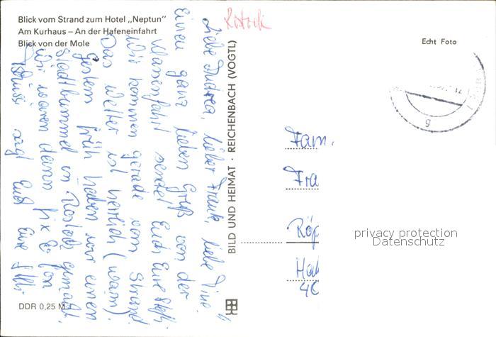 72335691 alte Postkarte Rostock-Warnemuende Strandpartie Hotel Neptun Kurhaus Hafeneinfahrt Mole postalisch gelaufen Erhaltung siehe scans KatCode: 11110013003000