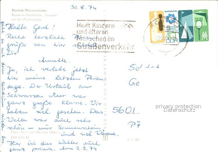 72152612 alte Postkarte Rostock-Warnemuende Teepott mit Leuchtturm und Promenade postalisch gelaufen Erhaltung siehe scans KatCode: 11110013003000
