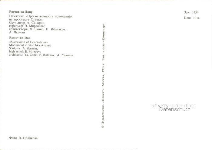 Rostov-On-Don Succession of Generations Monument Statchka Avenue postalisch nicht gelaufen Erhaltung siehe scans