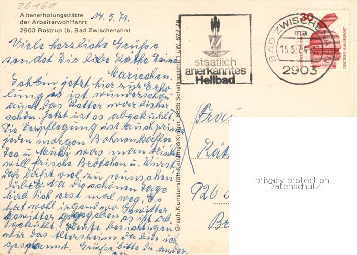 73724344 alte Postkarte Rostrup Altenerholungsstaette d. Arbeiterwohlfahrt Innen postalisch gelaufen Erhaltung siehe scans [LiesaD40] KatCode: 11110003451002
