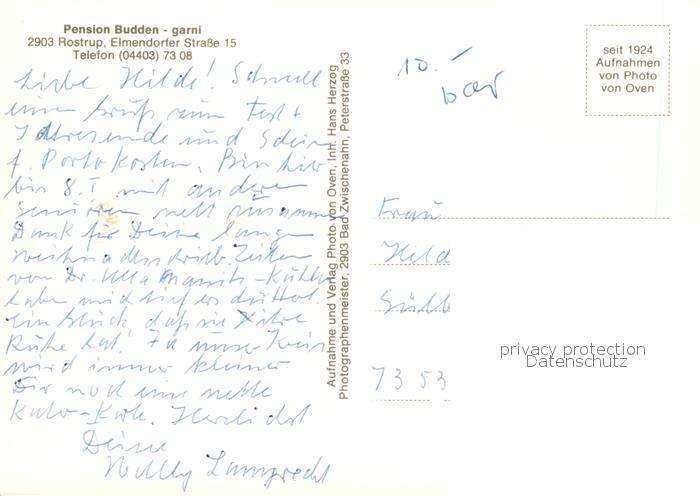 73844876 alte Postkarte Rostrup Pension Budden garni Gaststube Zimmer Park postalisch gelaufen Erhaltung siehe scans [FriedD77] KatCode: 11110003451002