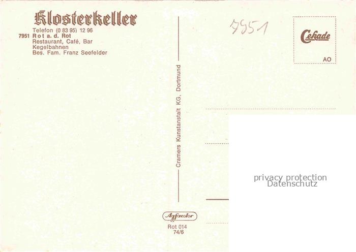 74050803 Rot an der Rot Biberach BW Restaurant Klosterkeller Gastraeume Kegelbahn postalisch nicht gelaufen Erhaltung siehe scans [WerneD78] Wern Katcode 11110008426100