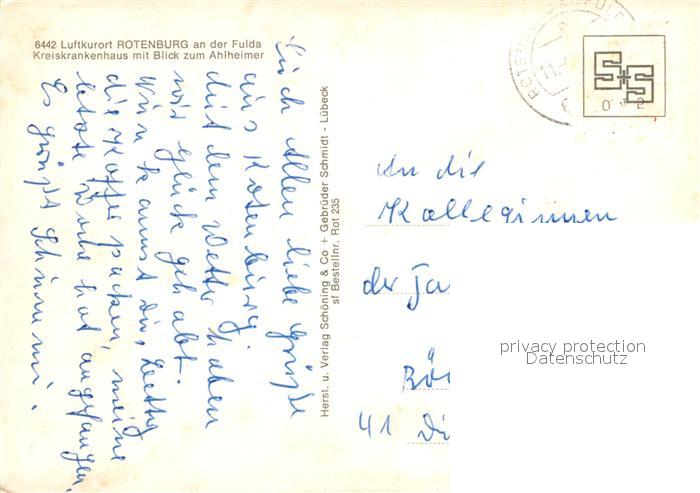 73012251 alte Postkarte Rotenburg Fulda Fliegeraufnahme Kreiskrankenhaus Ahlheimer postalisch gelaufen Erhaltung siehe scans [KathaD81] KatCode: 11110006632018