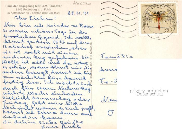 73755491 alte Postkarte Rotenburg Fulda Haus der Begegnung Haupthaus Tagungshaus Schwimmbadhaus Essraum postalisch gelaufen Erhaltung siehe scans [FriedD77] KatCode: 11110006632018