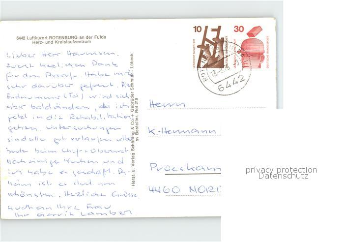 72256926 alte Postkarte Rotenburg Fulda Herz und Kreislaufzentrum postalisch gelaufen Erhaltung siehe scans KatCode: 11110006632018