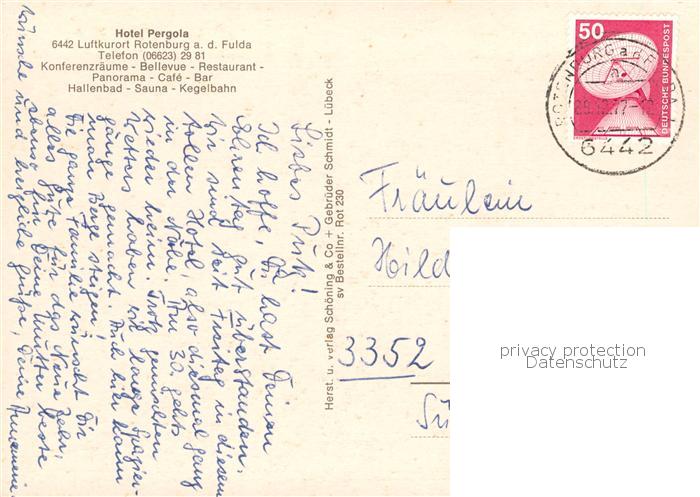 73844877 alte Postkarte Rotenburg Fulda Hotel Pergola Konferenzraeume Bellevue Restaurant Panorama Cafe Bar Schlosspark Brotgasse Altstadtblick Am Hexenturm postalisch gelaufen Erhaltung siehe scans [FriedD77] KatCode: 11110006632018