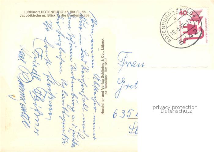 73157712 alte Postkarte Rotenburg Fulda Jacobikirche mit Breitenstrasse postalisch gelaufen Erhaltung siehe scans [WerneD78] KatCode: 11110006632018