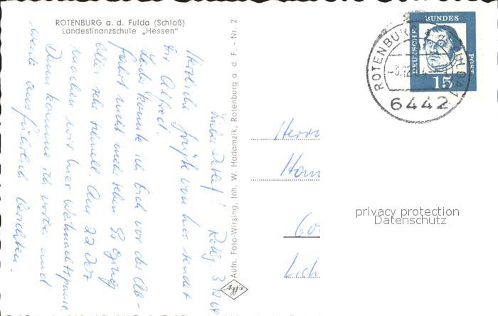 72294907 alte Postkarte Rotenburg Fulda Landesfinanzschule Hessen postalisch gelaufen Erhaltung siehe scans KatCode: 11110006632018
