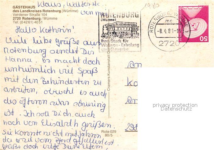 72932151 alte Postkarte Rotenburg Wuemme Gaestehaus des Landkreises Rotenburg postalisch gelaufen Erhaltung siehe scans [LiesaD40] KatCode: 11110003357039