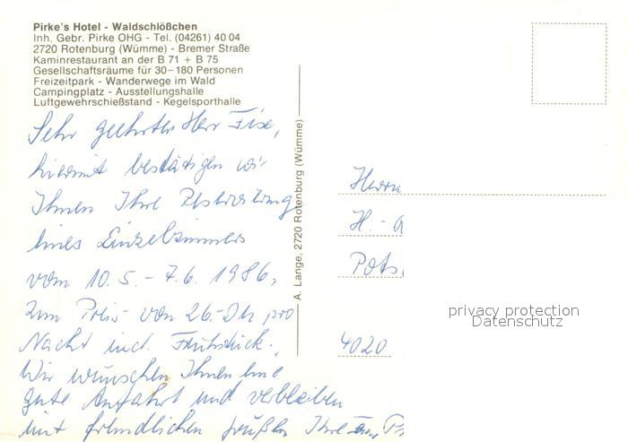 73614843 Rotenburg Wuemme Pirkes Hotel Waldschloesschen postalisch nicht gelaufen Erhaltung siehe scans [WerneD78] KatCode: 11110003357039