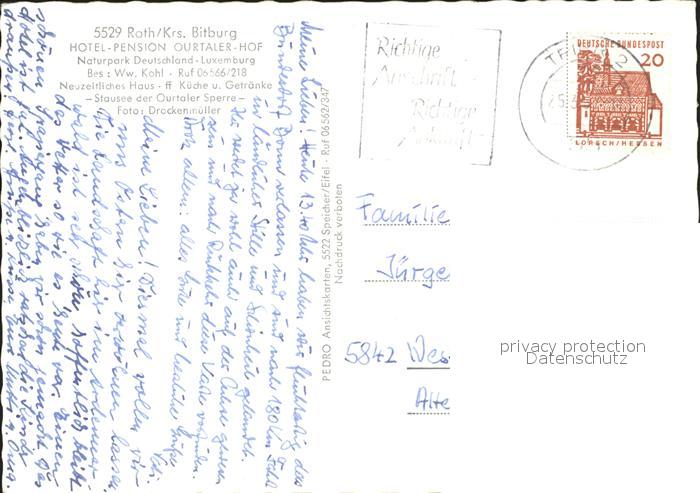 72002982 alte Postkarte Roth Our Hotel Pension Ourtaler Hof Naturpark Deutschland Luxemburg postalisch gelaufen Erhaltung siehe scans KatCode: 11110007232112