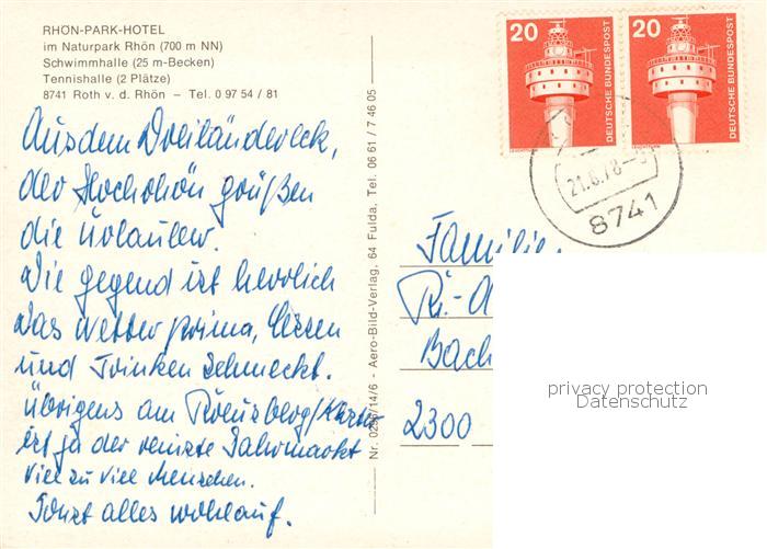 73760093 alte Postkarte Roth Rhoen-Grabfeld Rhoen Park Hotel Frankenstube Zimmer Rother Kamin Tennishalle postalisch gelaufen Fliegeraufnahme Erhaltung siehe scans [WerneD78] KatCode: 11110009673129
