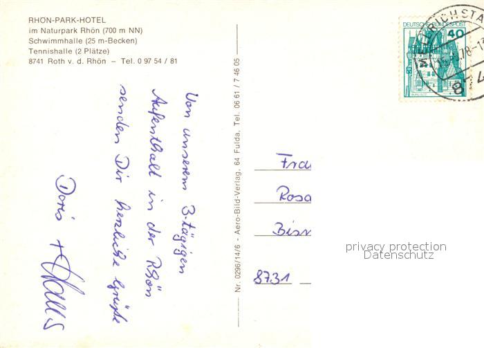 73167203 alte Postkarte Roth Rhoen-Grabfeld Rhoen Parkhotel Restaurant Tennishalle Hallenbad postalisch gelaufen Erhaltung siehe scans [FriedD77] KatCode: 11110009673129