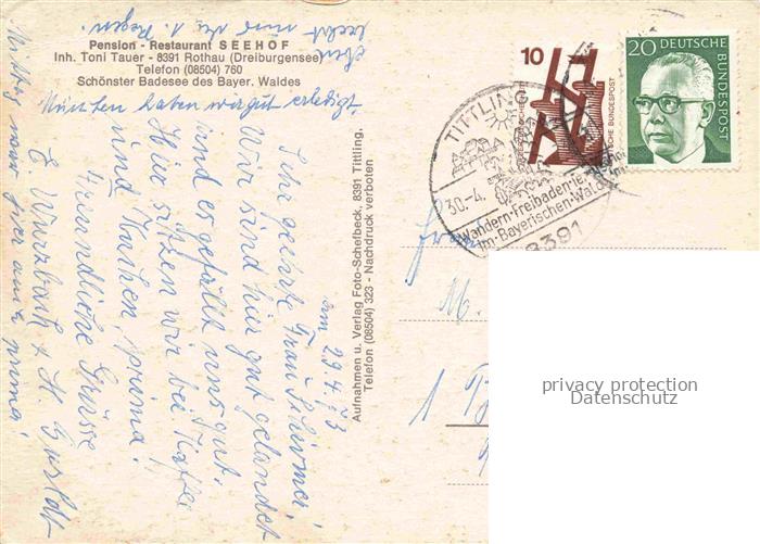 74096091 alte Postkarte Rothau Dreiburgensee Tittling Bayern Pension Restaurant Seehof Gastraum Freiterrasse Badesee postalisch gelaufen Erhaltung siehe scans [WerneD78] KatCode: 11110009275152