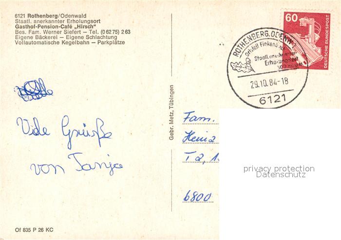 73172406 alte Postkarte Rothenberg Odenwald Gasthof-Pension Hirsch postalisch gelaufen Erhaltung siehe scans [PaolaD17] KatCode: 11110006437014