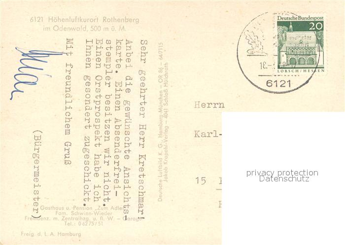 73648076 alte Postkarte Rothenberg Odenwald Hoehenluftkurort Fliegeraufnahme postalisch gelaufen Erhaltung siehe scans [FriedD77] KatCode: 11110006437014