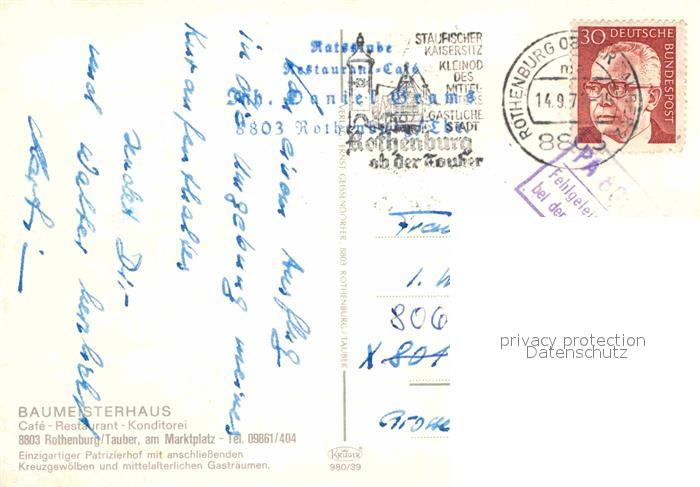 72916549 alte Postkarte Rothenburg Tauber Baumeisterhaus postalisch gelaufen Erhaltung siehe scans [NatalD47] KatCode: 11110009571193