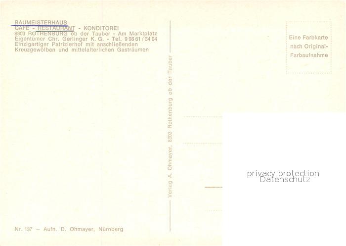 73643375 Rothenburg Tauber Baumeisterhaus Cafe Restaurant postalisch nicht gelaufen Erhaltung siehe scans [WerneD78] KatCode: 11110009571193