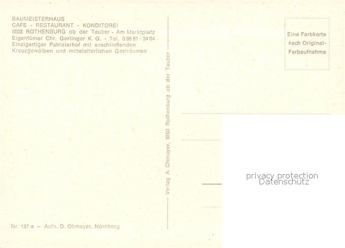 73323316 Rothenburg Tauber Baumeisterhaus Cafe Restaurant postalisch nicht gelaufen Erhaltung siehe scans [FriedD77] KatCode: 11110009571193