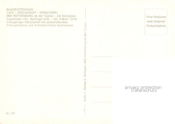 72989586 Rothenburg Tauber Baumeisterhaus Cafe Restaurant postalisch nicht gelaufen Erhaltung siehe scans [WerneD78] KatCode: 11110009571193