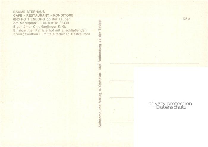 73174034 Rothenburg Tauber Baumeisterhaus Cafe Restaurant Konditorei postalisch nicht gelaufen Erhaltung siehe scans [FriedD77] KatCode: 11110009571193