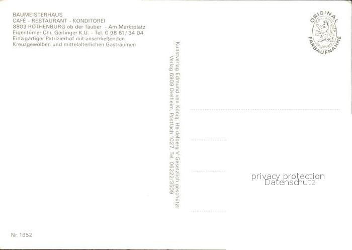 72448545 Rothenburg Tauber Cafe Restaurant Baumeisterhaus postalisch nicht gelaufen Erhaltung siehe scans KatCode: 11110009571193