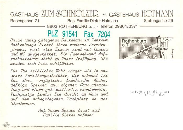 73542364 Rothenburg Tauber Gasthaus Zum Schmoelzer Gaestehaus Hofmann postalisch nicht gelaufen Werbekarte (keine Postkarte) Erhaltung siehe scans [KathaD81] KatCode: 11110009571193