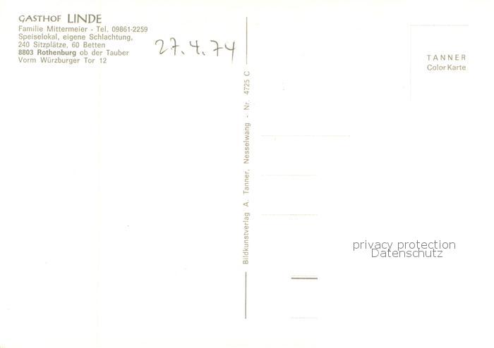 73777548 Rothenburg Tauber Gasthof Linde Restaurant postalisch nicht gelaufen Erhaltung siehe scans [FriedD77] KatCode: 11110009571193