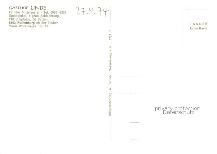 73777546 Rothenburg Tauber Gasthof Linde postalisch nicht gelaufen Erhaltung siehe scans [FriedD77] KatCode: 11110009571193