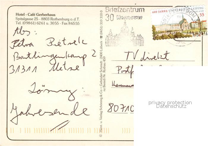 73646124 alte Postkarte Rothenburg Tauber Hotel Cafe Gerberhaus Gastraeume Zimmer Gartenterrasse postalisch gelaufen Erhaltung siehe scans [WerneD78] KatCode: 11110009571193