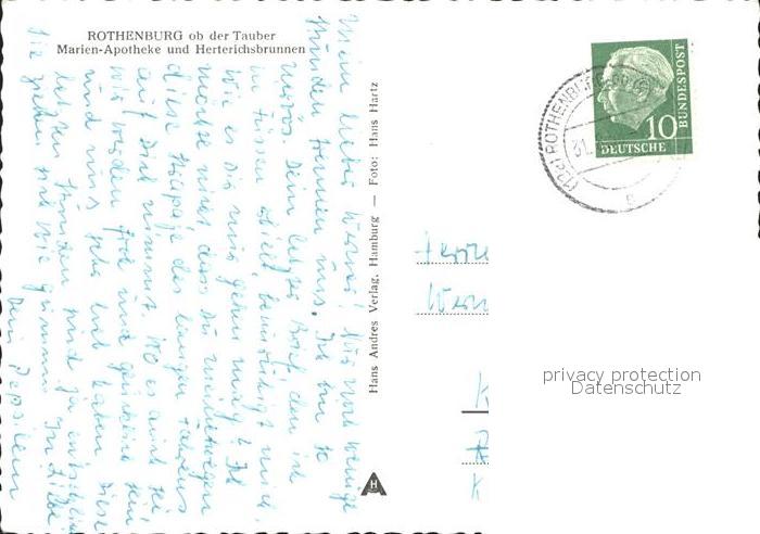 72201653 alte Postkarte Rothenburg Tauber Marien-Apotheke und Herterlichsbrunnen postalisch gelaufen Erhaltung siehe scans KatCode: 11110009571193
