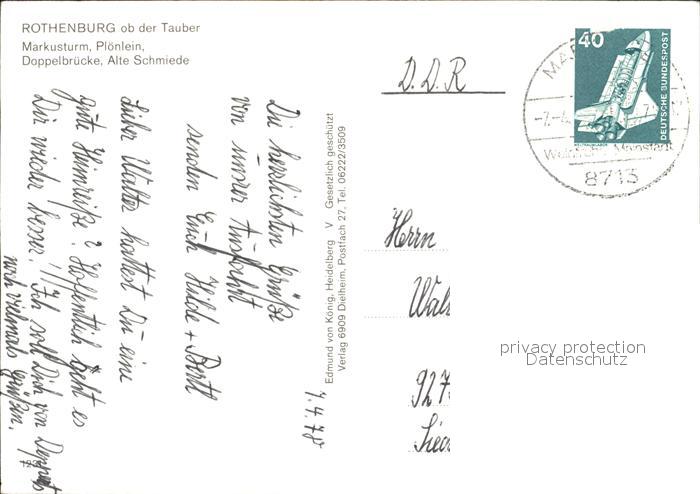 72423575 alte Postkarte Rothenburg Tauber Markusturm Ploenlein Doppelbruecke Alte Schmiede postalisch gelaufen Erhaltung siehe scans KatCode: 11110009571193