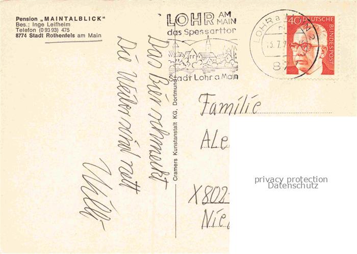 74157695 alte Postkarte Rothenfels Main Unterfranken Main-Spessart Bayern Pension-Maintalblick Main Flussschleuse Damm Hirsch Terrasse Restaurant Innenraum Spessart postalisch gelaufen Erhaltung siehe scans [Karloger] KatCode: 11110009677181