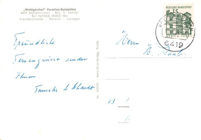 73873710 alte Postkarte Rothenkirchen Huenfeld Waldgasthof Forellen-Rainmuehle postalisch gelaufen Erhaltung siehe scans [FriedD77] KatCode: 11110006631002