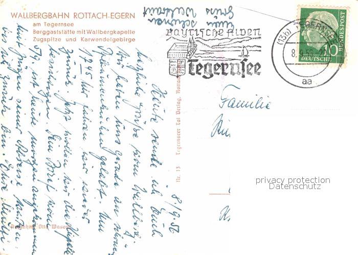 72686431 alte Postkarte Rottach-Egern Wallbergbahn Berggastst?tte Sonnenterrasse Wallbergkapelle Zugspitze Karwendelgebirge postalisch gelaufen Erhaltung siehe scans [FriedD77] KatCode: 11110009182129