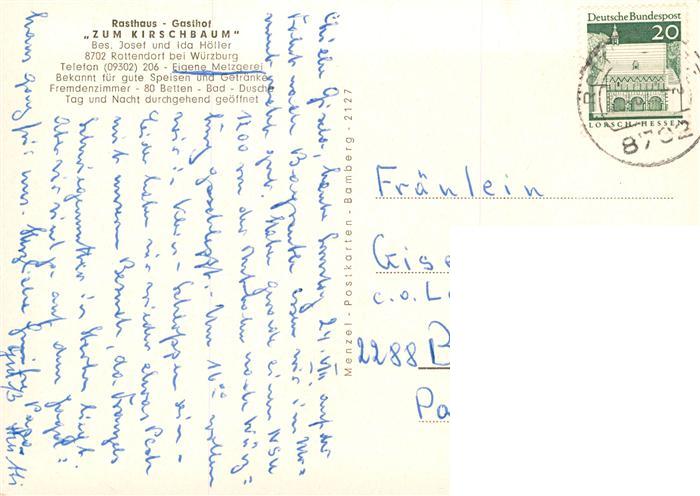 73874301 alte Postkarte Rottendorf Wuerzburg Unterfranken Rasthaus Gasthof zum Kirschbaum postalisch gelaufen Erhaltung siehe scans [FriedD77] KatCode: 11110009679185