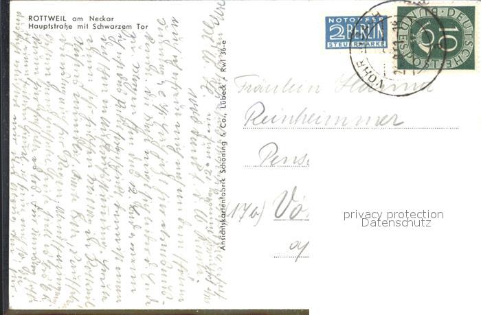 72099120 alte Postkarte Rottweil Neckar Hauptstrasse mit Schwarzem Tor postalisch gelaufen Erhaltung siehe scans KatCode: 11110008325049
