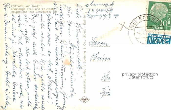 72707483 alte Postkarte Rottweil Neckar Hauptstrasse mit Schwarzem Tor postalisch gelaufen Erhaltung siehe scans [LiesaD40] KatCode: 11110008325049