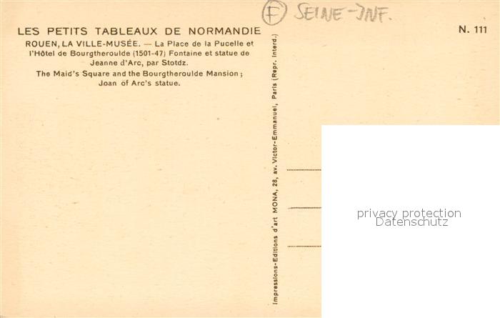 13689029 Rouen Musee Place de la Pucelle Hôtel de Bourgtheroulde Fontaine et Statue de Jeanne d Arc postalisch nicht gelaufen Erhaltung siehe scans [FriedD77] Frie Katcode 11170076376540